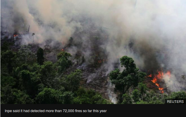 Inpeによると今年1月から8月までで72000件も森林火災が起こっており、これは2013年からの観測史上最大である。さらに、8月15日(木)から9500件もの火災が主にアマゾン地域から観測されている。