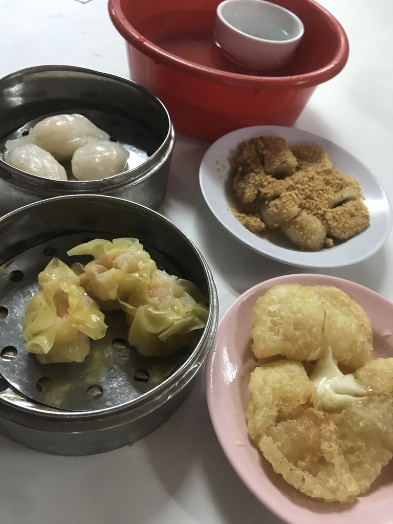 まずお茶を注文。その後は注文をしにカウンターへ。好きなのを選ぶと店員さんが席まで運んでくれる。シュウマイ、餃子、ゴマ団子、チキンライス(写真手前)を注文。レベル高い。
