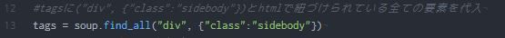 tagsに("div", {"class":"sidebody"})とhtmlで紐づけられている全ての要素を代入
